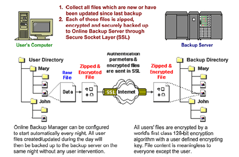 E-Storage Backup is an improved and convenient alternative to the traditional process of storing backup copies of your computer data without dealing with media like tapes and CD's. Your data is stored securely and automatically via your standard internet connection and is available around the clock. Your data is compressed and encrypted before leaving your computer.The E-Storage Backup Service runs as two programs - one on your computer called the "client", the other on our servers called the "server". These two programs communicate with each other using encrypted and compressed data transfers that quickly and securely store your critical data in our electronic data vault. Only you have access to this password protected data. Once the data is transferred, you are able to retrieve any of your backed up files by running the "client" software in restore mode.